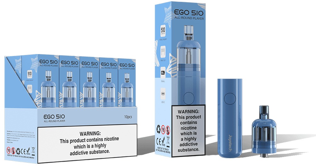 Joyetech eGo 510: 850mAh pil, 2ml pod kapasitesi, 0.8 Ohm coil. Button triggered vaping, USB-C şarj. Kompakt, güçlü ve kullanıcı dostu. Başlangıç ​​kiti.