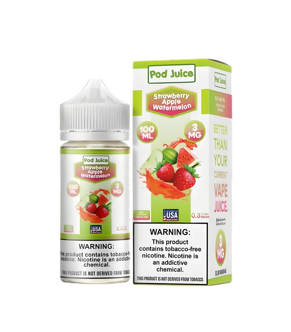 Pod Juice Strawberry Apple Watermelon, çilek, elma ve karpuz aromalarının tatlı ve ferah uyumunu sunan tropikal bir elektronik sigara likitidir. 70VG / 30PG oranı sayesinde yoğun buhar ve güçlü aroma dengesi sağlar. 100 mL şişede; 0 mg, 3 mg ve 6 mg nikotin seçenekleriyle üretilmiştir.
