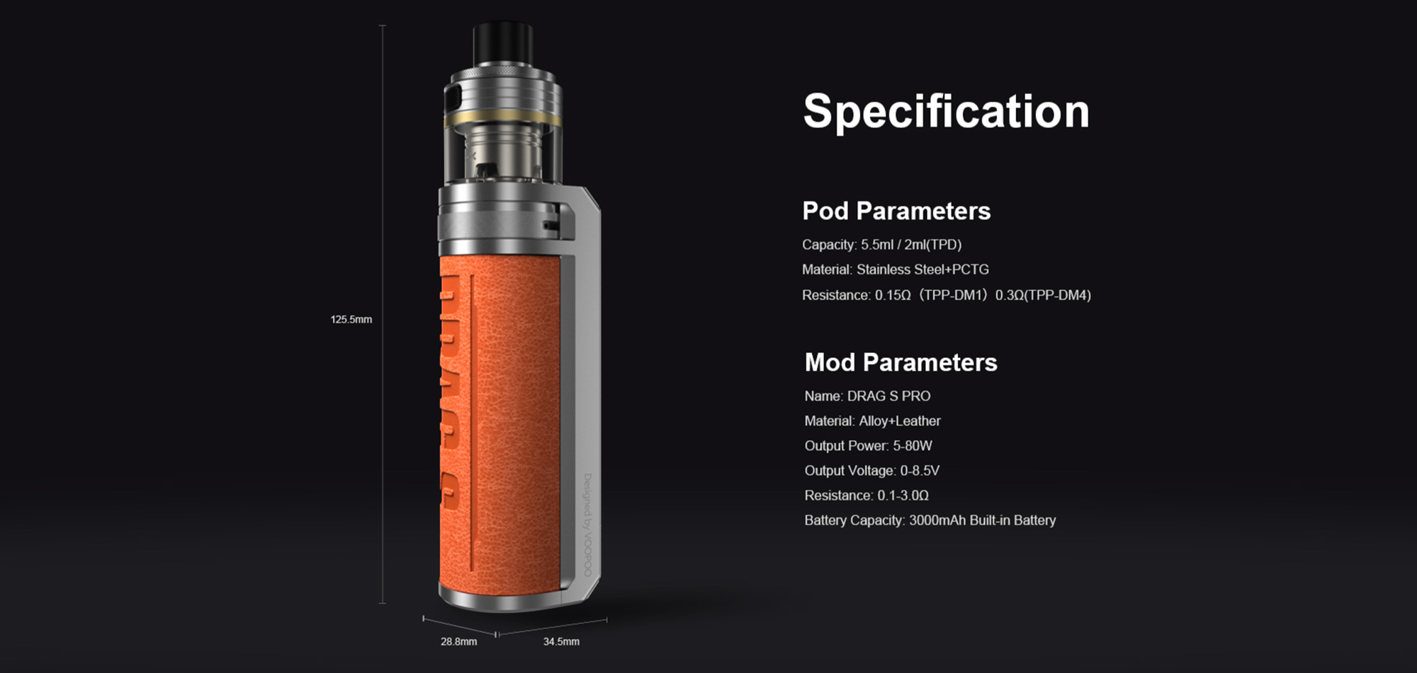 Voopoo Drag S Pod Mod60W’a kadar güç çıkışı sağlar. Ayrıca, deri ve metalin kusursuz birleşimi sayesinde hem dayanıklı hem de şık bir görünüm kazanmıştır.