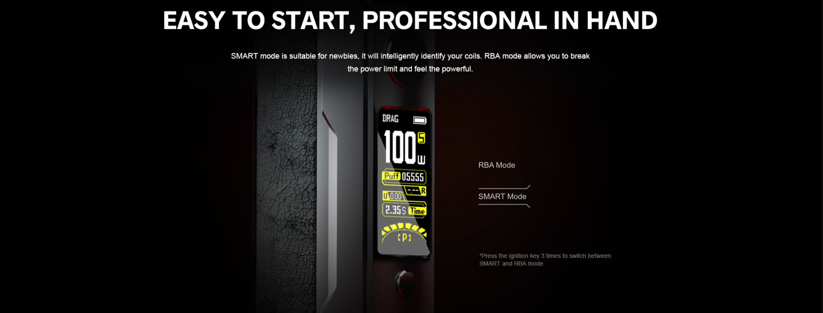 Akıllı Mod işlevi, kullanılan bobinleri otomatik olarak tanır ve buna göre güç ayarlarını optimize eder, bu da cihazı kullanmak için gerekli deneyim seviyesini azaltır. Ancak, 100W güç çıkışı, daha çok deneyime sahip olan gazeteciler tarafından tercih edilen bir özelliktir. RBA modu, ileri düzey kullanıcıların Akıllı Mod'u atlayarak kendi ayarlarını düzenleyebileceği anlamına gelir.