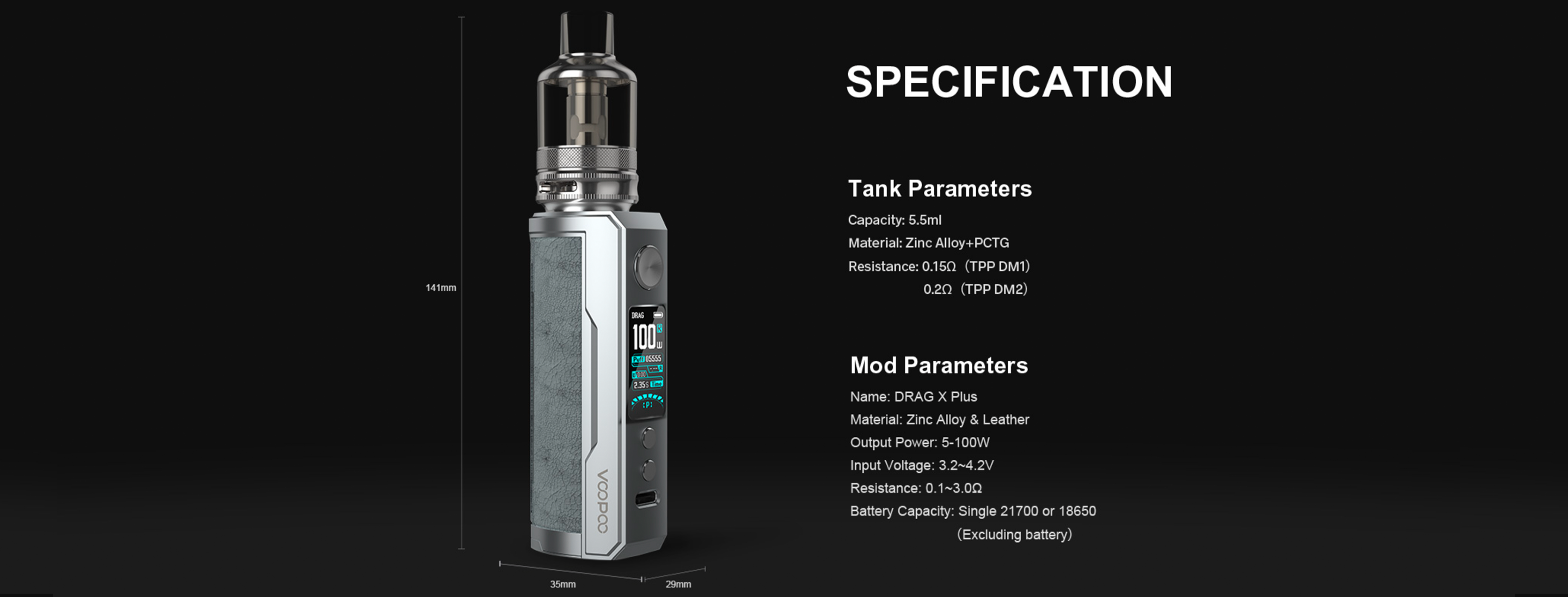 VOOPOO DRAG X Plus Pod Mod, tek bir 18650 veya 21700 pil ile çalışan bu mod, 100W’a kadar çıkış gücü sağlayabilir.